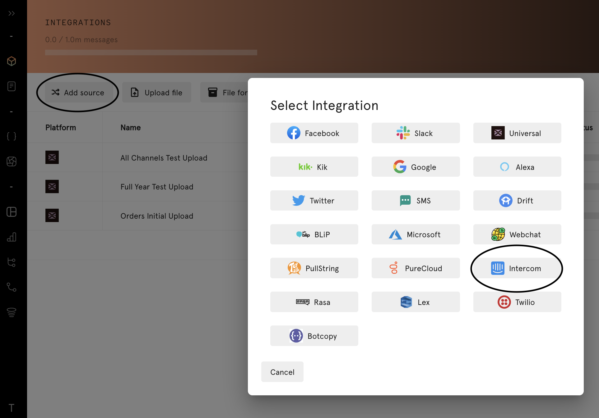 Connect in the UI by selecting "Add Source" and then "Intercom"